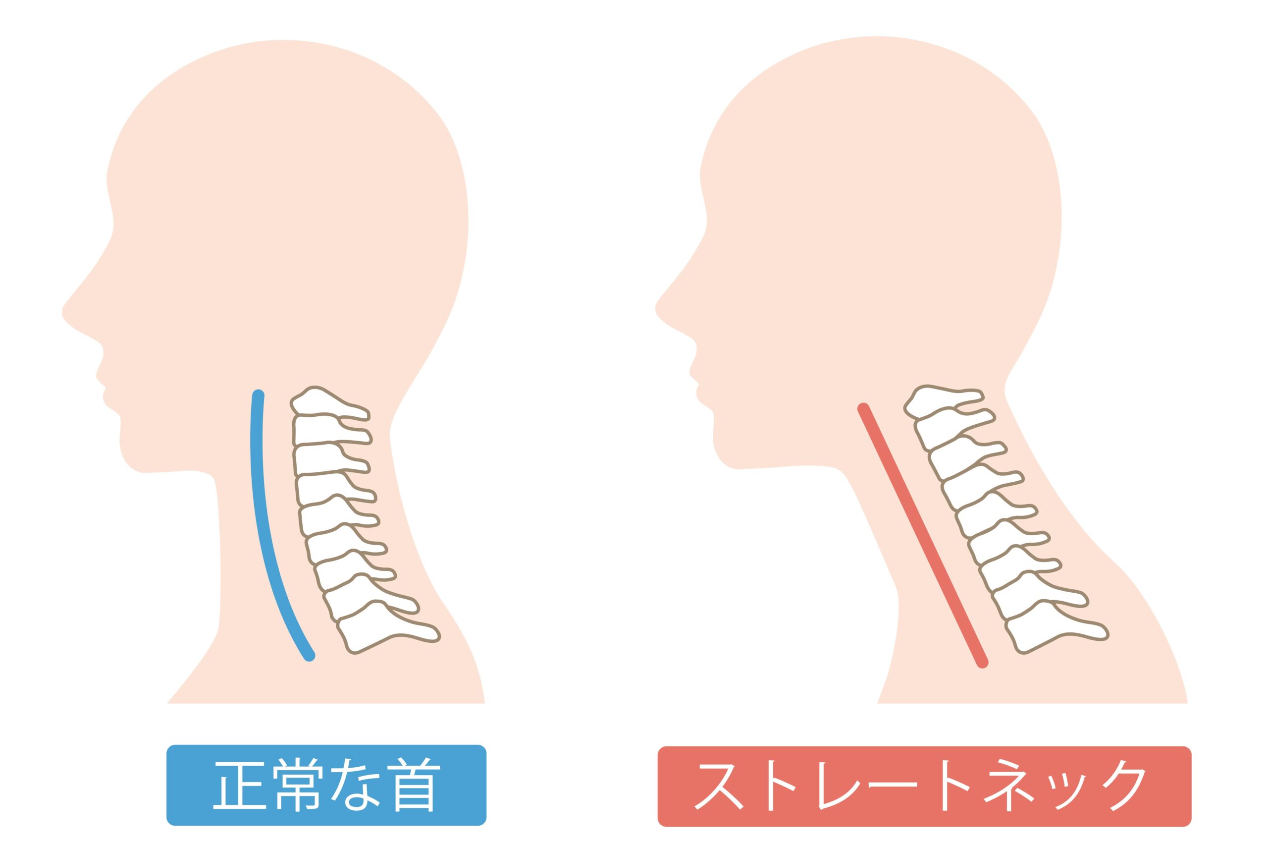 しかし、スマホやパソコンの長時間使用、猫背姿勢の継続などによって、このカーブが失われ、首の骨がまっすぐに近づいた状態を「ストレートネック」と呼びます。