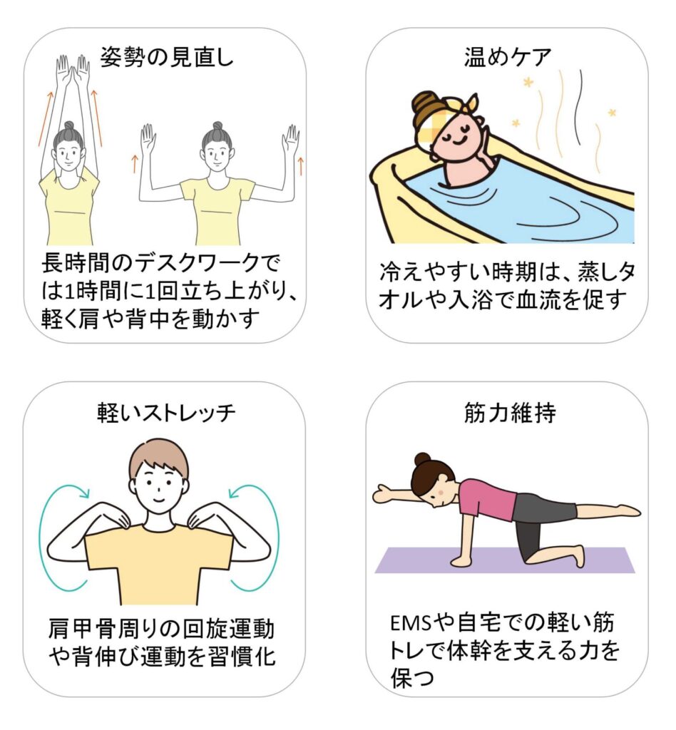 - 長時間同じ姿勢による血流低下や筋肉のこわばり