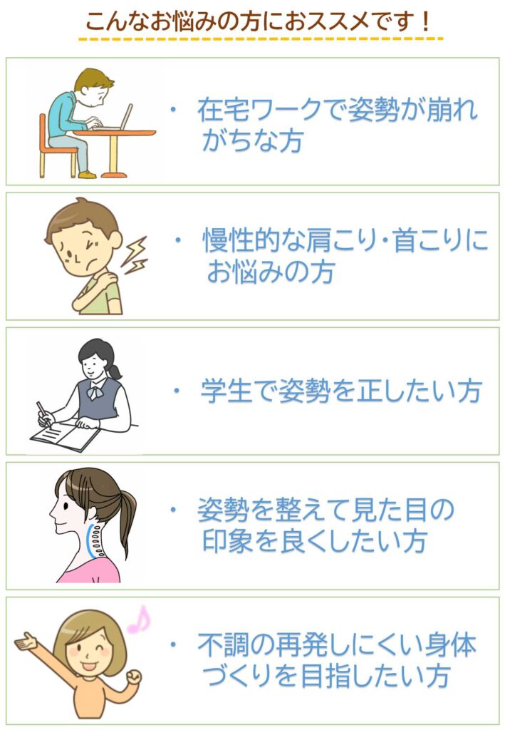 「最近姿勢が気になる」「肩こりや疲れがなかなか抜けない」そんなお悩みがあれば、まずはお気軽にご相談ください。